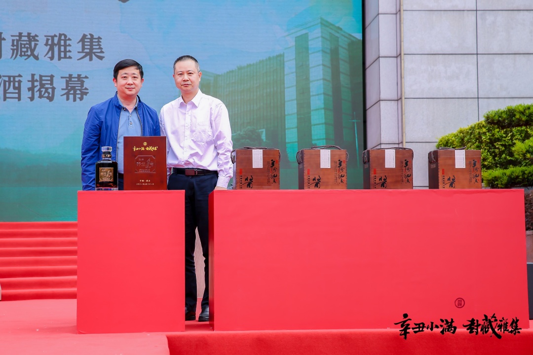 活动中副总裁李晖、曾品堂创始人曾宇先生一起为劲牌养生1号·2021封藏纪念版揭幕。