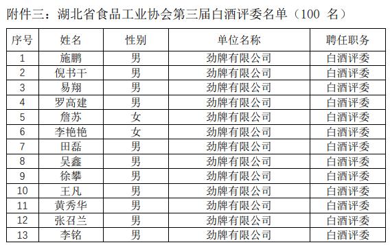 近日,湖北省食品工业协会第三届白酒评委名单公布,劲牌研究院副院长杨强被聘任为白酒专家委员会副主任,高级技术经理童国强被聘任为白酒专家委员会委员,此外胡志平、柯锋、管莹、万朕四名国家评委被聘任为特邀评委。